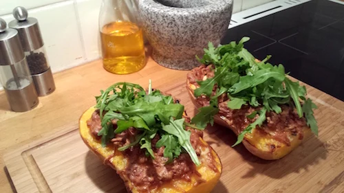 Gefüllter Butternut-Kürbis ist das Herbstrezept zum gemeinsamen Kochen. Die leicht nussige Kürbisnote macht den Butternutkürbis besonders schmackhaft.