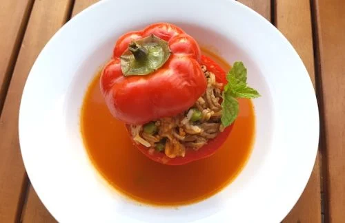 - Die gefüllten Paprika in die Suppe geben. Alles für 30-40 Minuten leicht kochen lassen.
